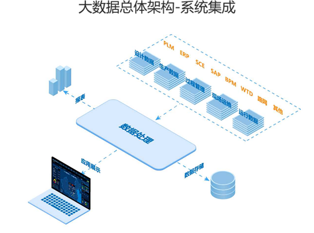 见著科技的数据中台可对接公司信息化管理系统ERP企业资源计划、PLM产品生命周期管理、MES制造执行系统、BPM业务流程管理、KMS知识管理系统等,应用大数据技术,对收集的海量数据进行采集、清洗、动态展示、建立模型、预测分析等技术处理,实现从设计、工艺、制造、交付到运维的全生命周期数据管理。